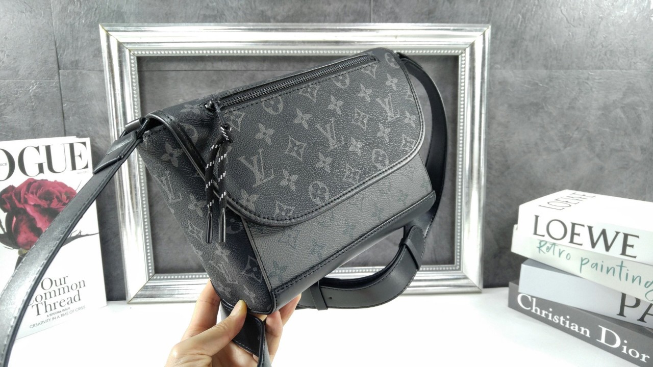 모노그램 이클립스 리버스 코팅 캔버스 카우하이드 가죽 소재의 트리밍 텍스타일 소재의 안감 블랙 색상의 하드웨어 자석형 플랩 잠금장치가 달린 메인 수납공간 끈 잠금장치가 있는 플랩 포켓 내부 플랫 포켓