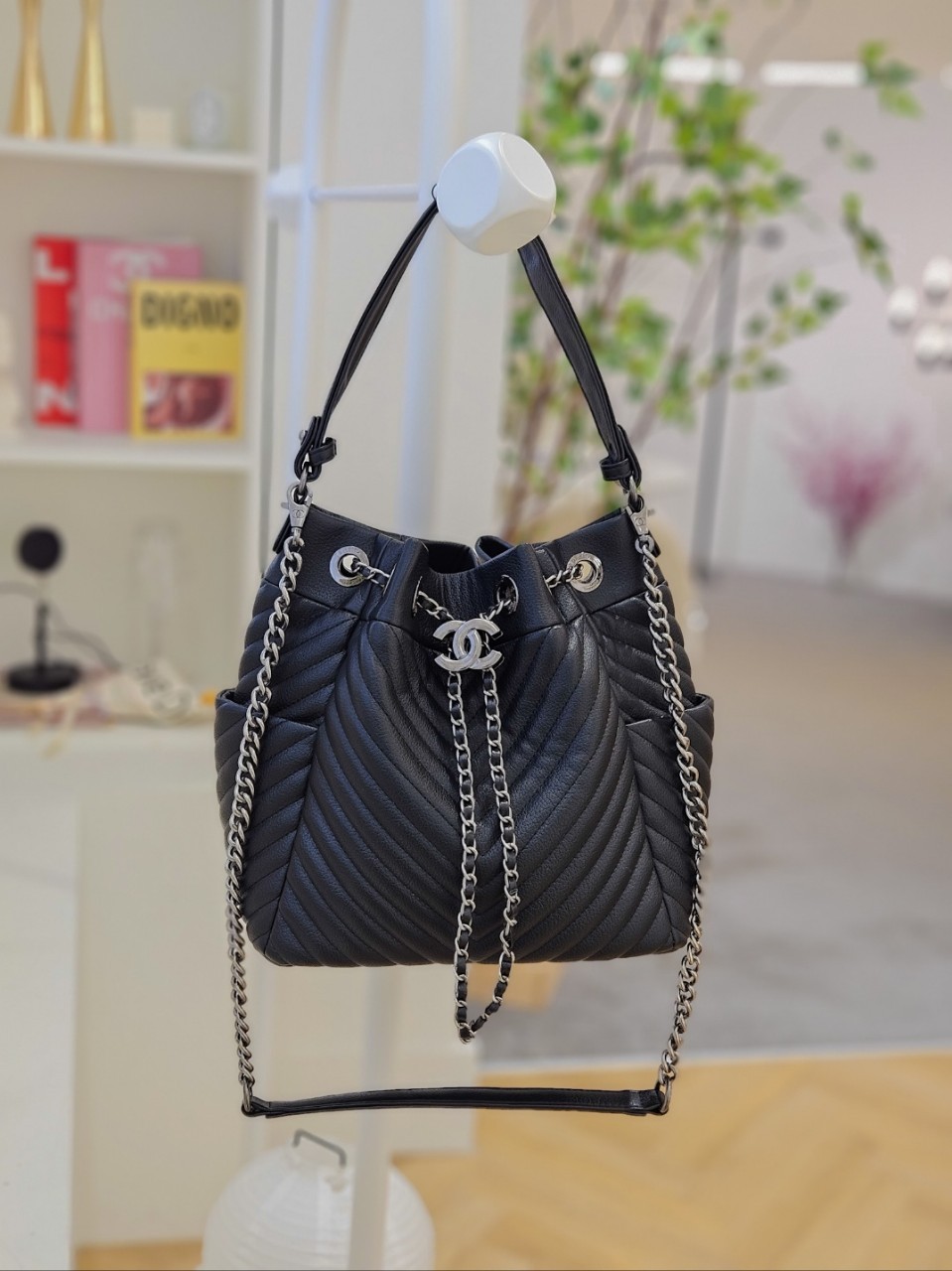 [국내배송]샤넬 드로우스트링 은장 체인 버킷 라지백 마드모아