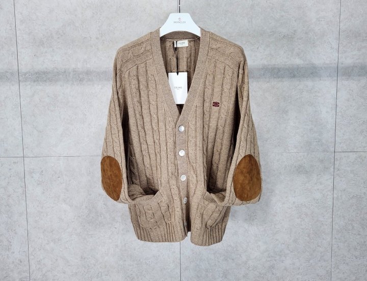 캐시미어 100% 가죽 소재 : 고트스킨 트리옹프 자수 클래식 핏 V넥 래글런 슬리브 골지 마감 웰트 포켓 2개 스웨이드 엘보 패치 2개 CELINE PARIS 각인 마더 오브 펄 버튼 5개