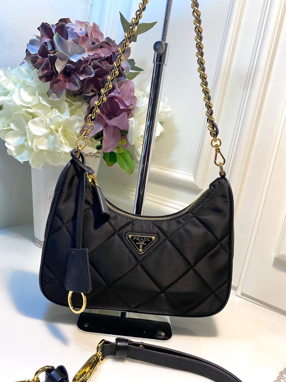 가벼운 패딩에 탑 스티치 처리 가죽을 꼬아서 넣은 체인 핸들 탈부착형 가죽 키링 메탈 하드웨어 전면 에나멜 메탈 트라이앵글 로고 지퍼 클로저 로고 프린트 리나일론 라이닝